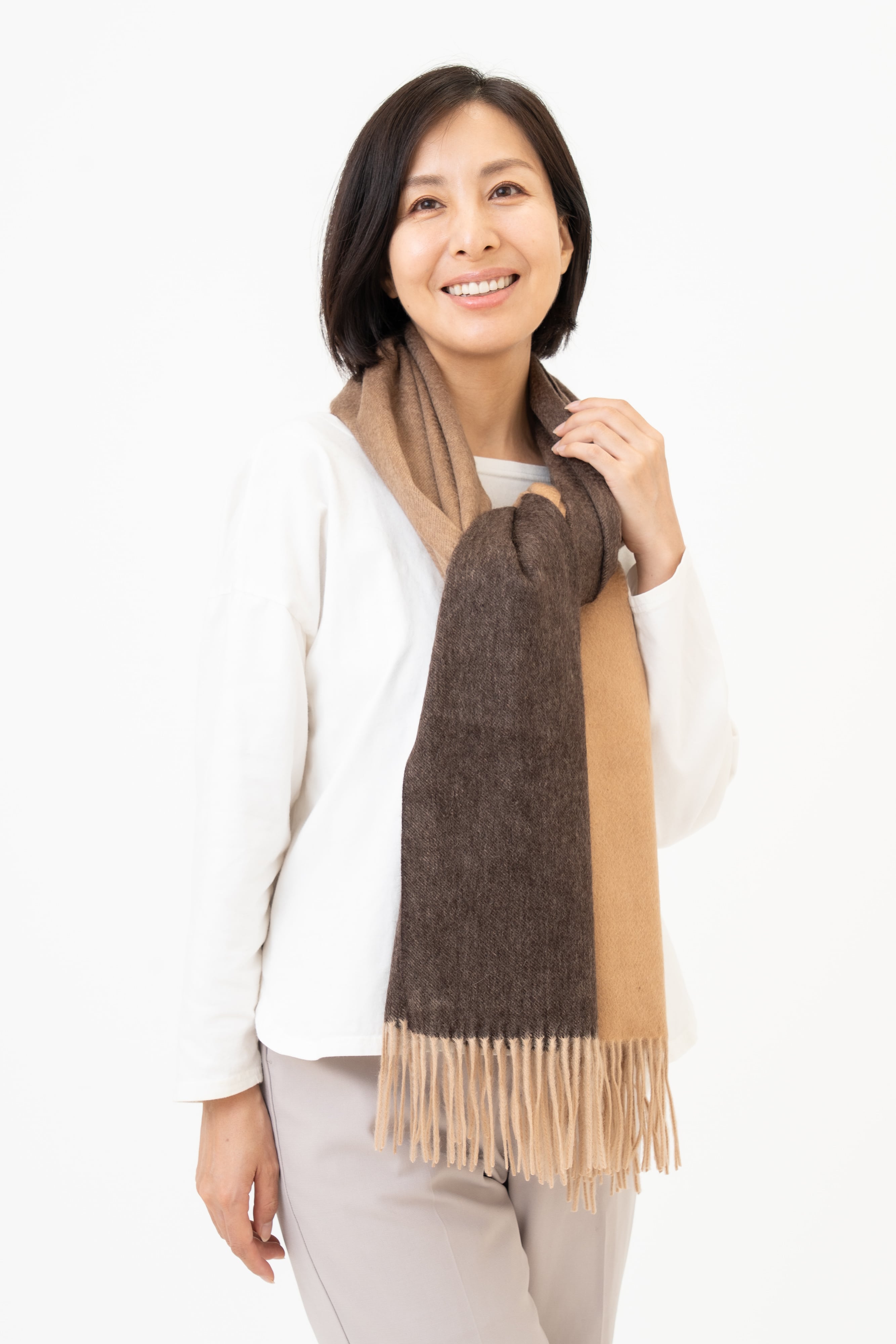 かすり染めしたカシミヤ100%の糸を使い、3色のシックな色合いで織り上げ