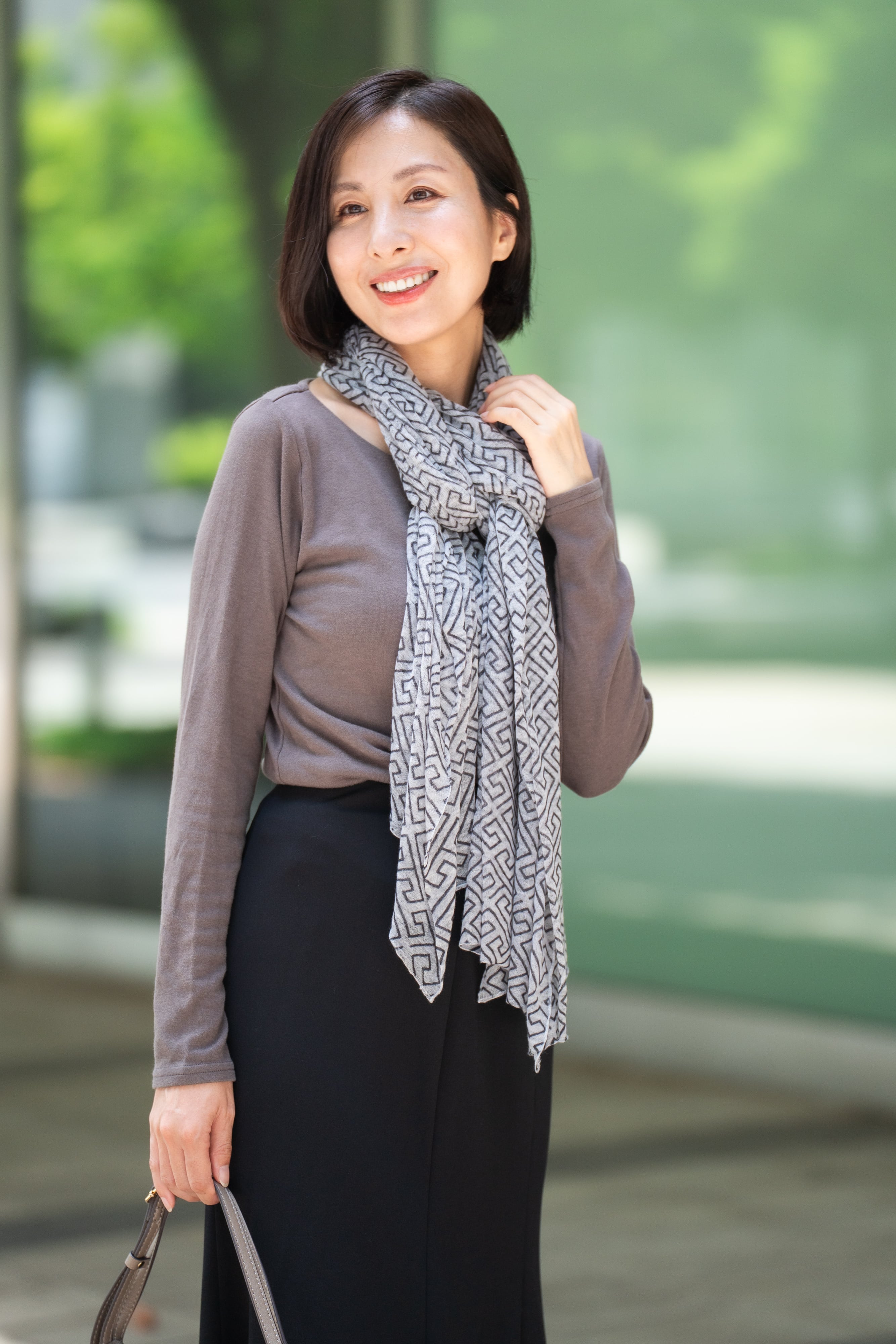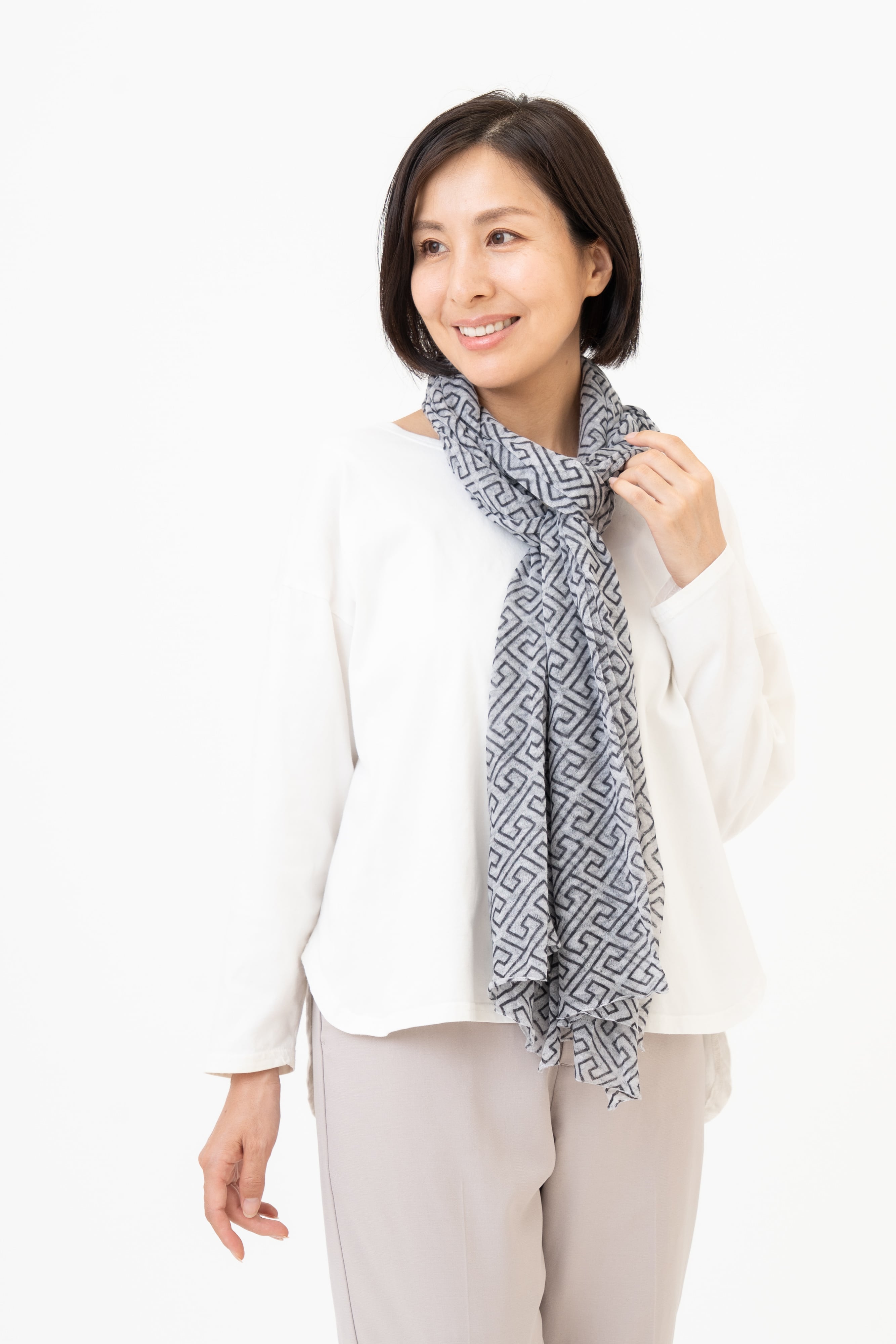 ドレープ性に優れた、やわらかなカシミヤ100%のニットストールです。軽やかでしっとりとした肌触りは、一度肩にかけると自然に身体に沿い、動くたびに美しい陰影を生み出します。シックな幾何学模様は、無地のコートやニットにさらりと合わせるだけで上品で洗練された印象に。デイリーの外出から特別なお出かけまで、幅広いスタイルに溶け込みます。軽さと暖かさを兼ね備えた大判サイズで、首にふんわり巻いたり、肩から羽織ったりとアレンジも自在。一枚あるだけで装いに立体感と華やぎを添えてくれるストールです。
