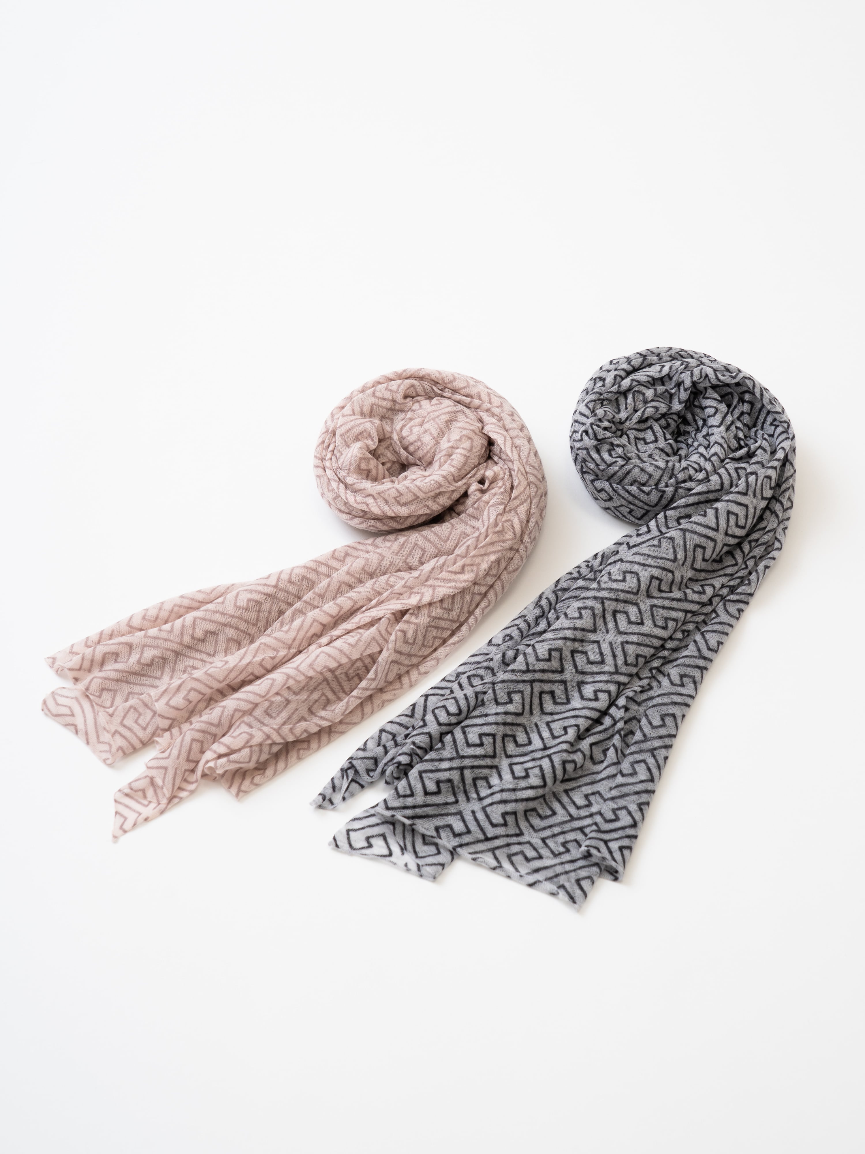 ドレープ性に優れた、やわらかなカシミヤ100%のニットストールです。軽やかでしっとりとした肌触りは、一度肩にかけると自然に身体に沿い、動くたびに美しい陰影を生み出します。シックな幾何学模様は、無地のコートやニットにさらりと合わせるだけで上品で洗練された印象に。デイリーの外出から特別なお出かけまで、幅広いスタイルに溶け込みます。軽さと暖かさを兼ね備えた大判サイズで、首にふんわり巻いたり、肩から羽織ったりとアレンジも自在。一枚あるだけで装いに立体感と華やぎを添えてくれるストールです。
