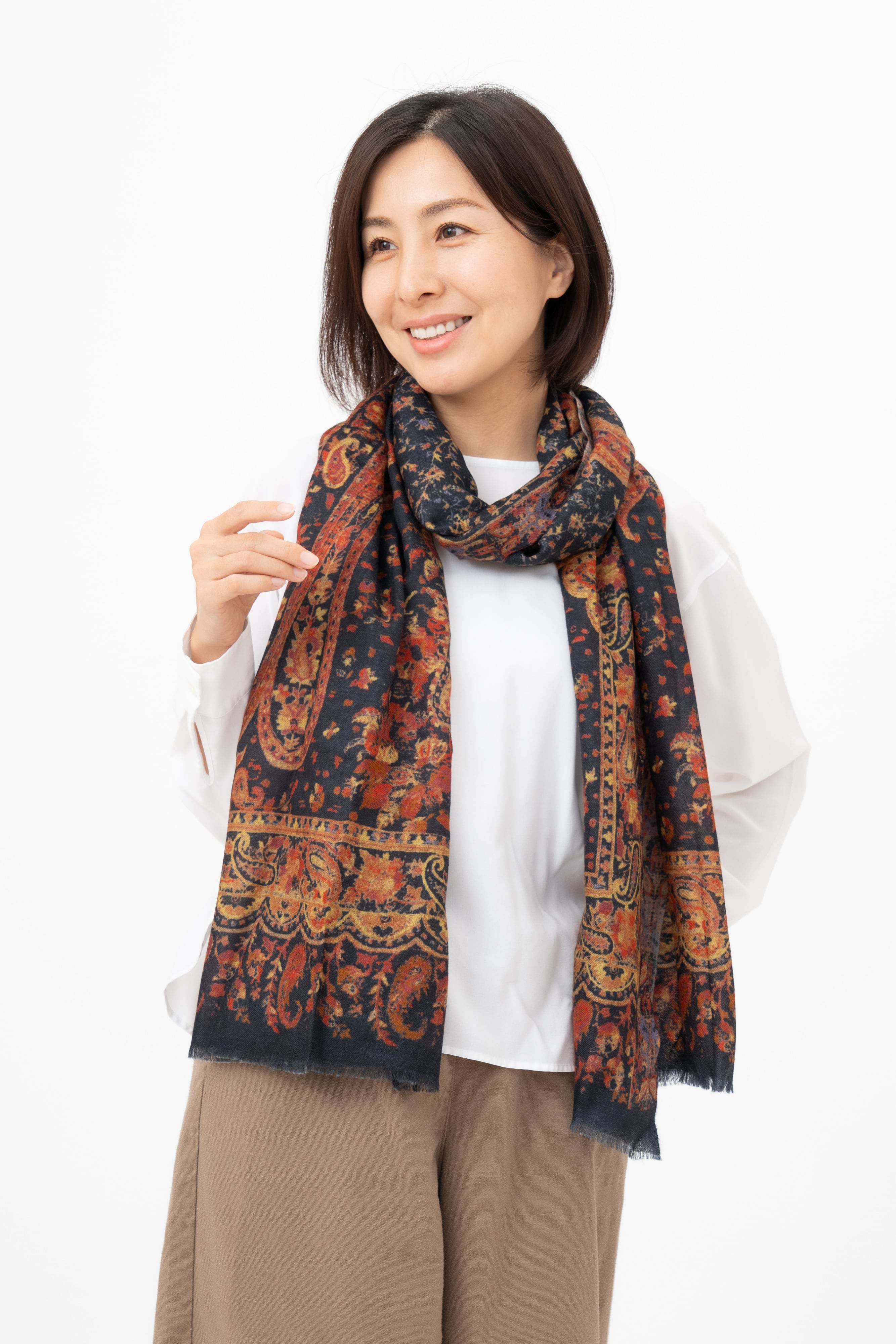 インド北西部カシミール高地で育まれたカシミヤ山羊の毛を原料に織り上げた生地に、繊細なプリントを施したストールです。インドは古来よりヨーロッパの繊維製品の生産地として知られ、その長い歴史の中で培われた企画力と生産技術は世界的に高く評価されています。今回、その確かな背景を持つインドにてプリントストールを生産いたしました。70×200cmの大判サイズでありながら、カシミヤ100%・わずか80gという軽やかさ。羽織りとしても、襟元のアクセントとしても、ジャケットのインナースタイルにも自在に取り入れられる、使いやすく洗練された一枚です。