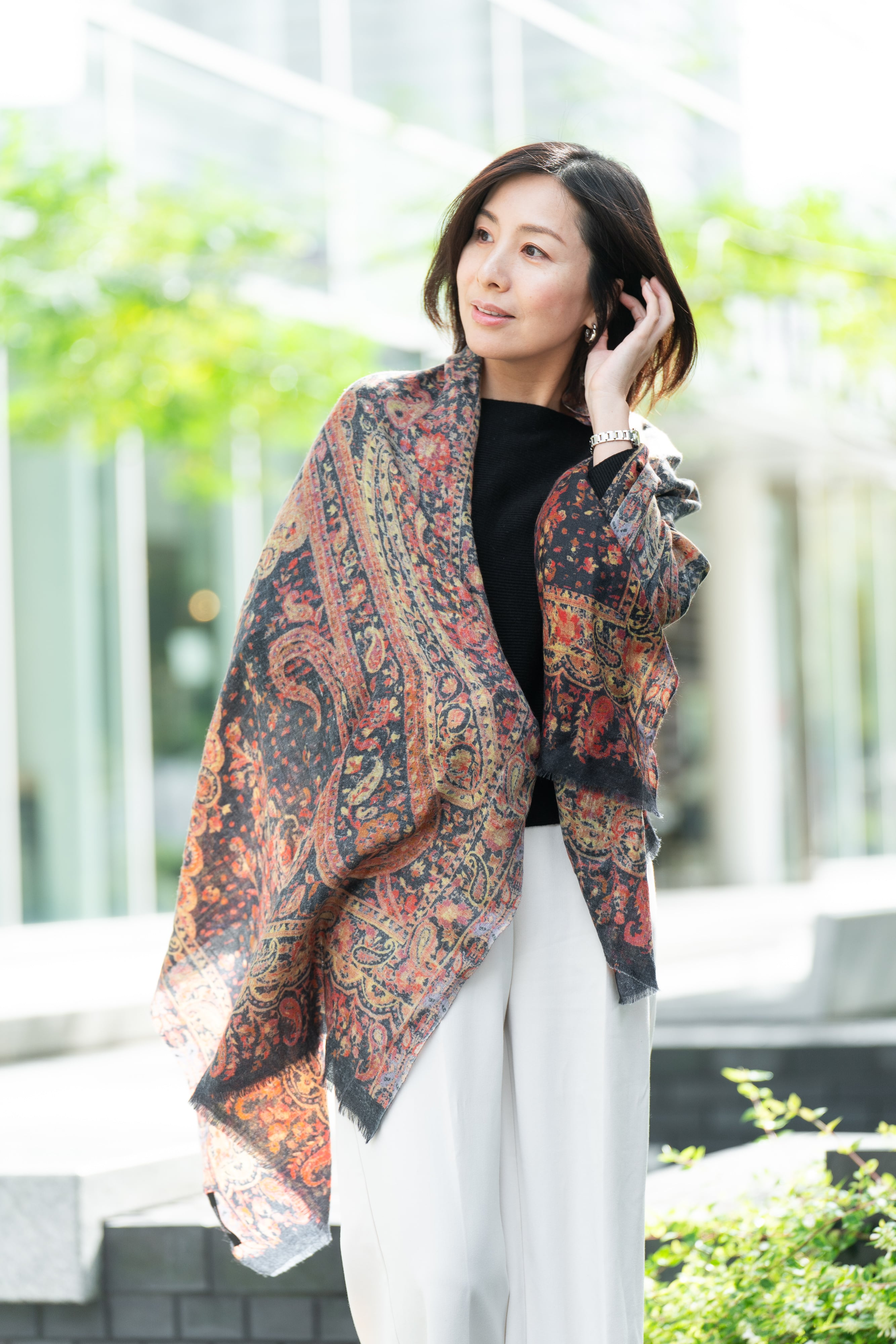 カシミールの自然とインドの色彩、そして都会的な洗練が融合した、新しいラグジュアリーストールの世界観。エスニックな色彩がもつ異国情緒に、現代的で洗練されたスタイリングを融合。羽織るだけで、日常を旅するような解放感と、ラグジュアリーな余韻をもたらします。