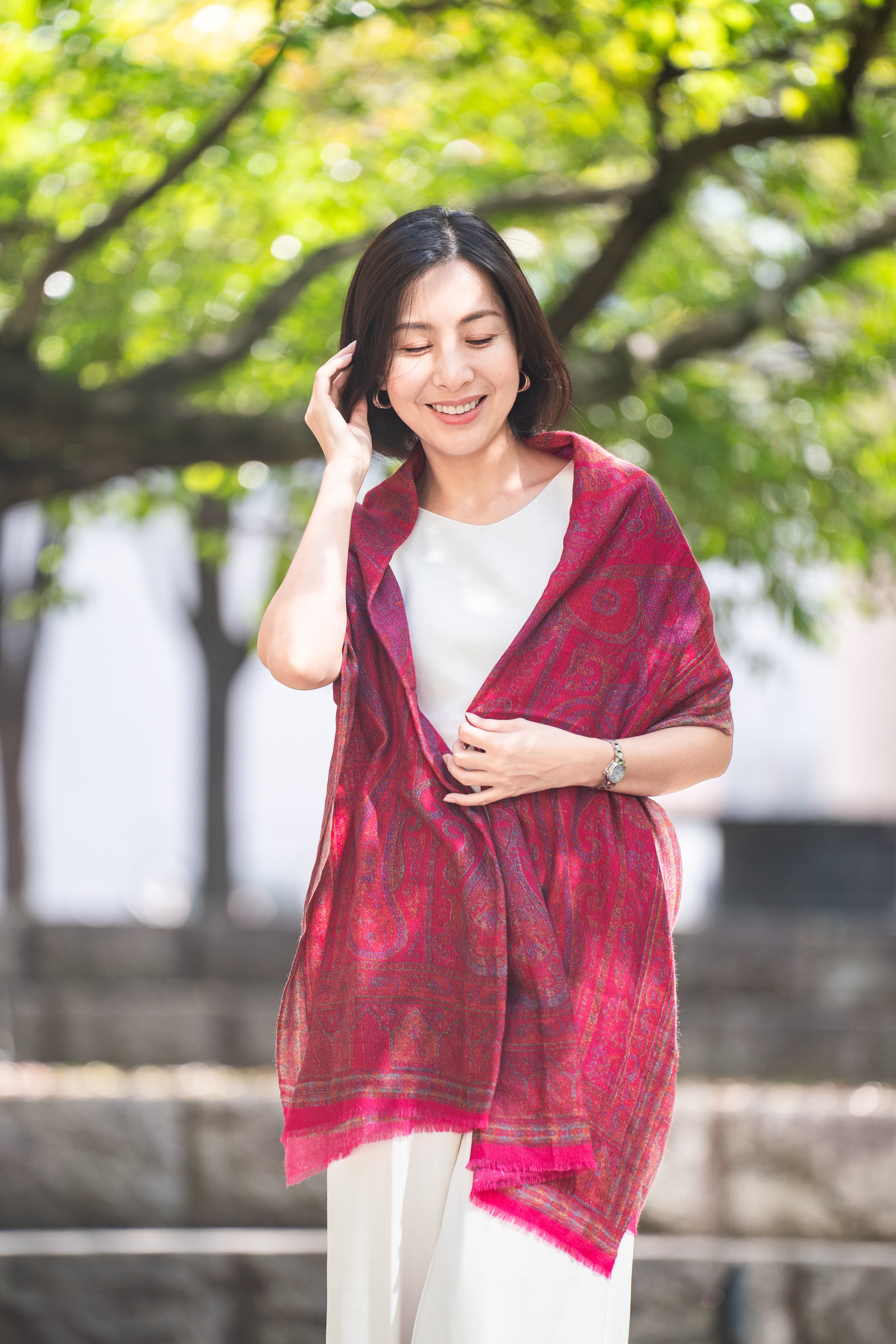 カシミールの自然とインドの色彩、そして都会的な洗練が融合した、新しいラグジュアリーストールの世界観。エスニックな色彩がもつ異国情緒に、現代的で洗練されたスタイリングを融合。羽織るだけで、日常を旅するような解放感と、ラグジュアリーな余韻をもたらします。
