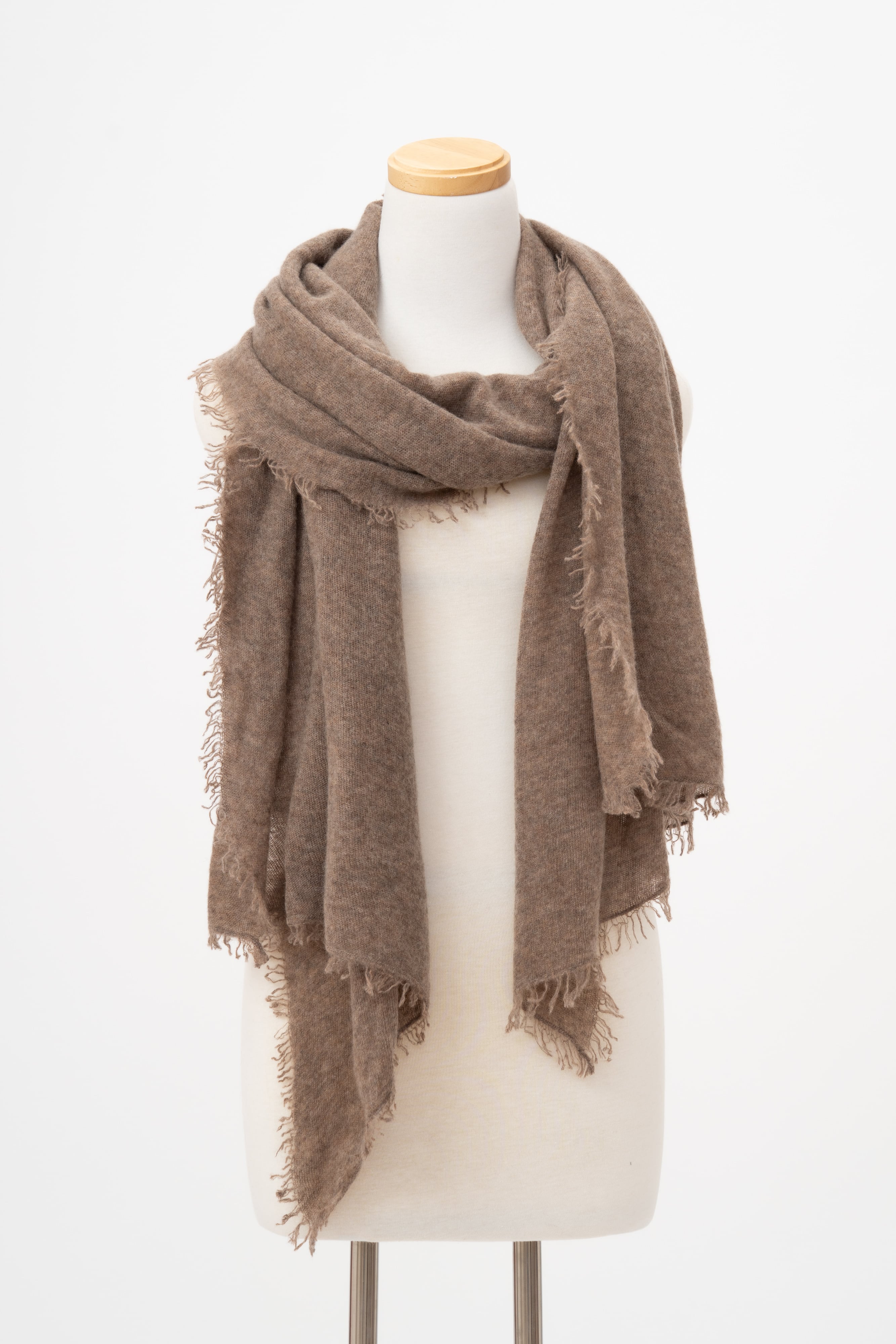 インド北西部の高山地帯・カシミール地区で育ったカシミヤ山羊の毛を、染色を一切施さず、そのまま編み上げた贅沢なストールです。カシミヤ糸本来のナチュラルな色合いを楽しんでいただけるとともに、ニットならではの柔らかな風合いと、包み込むような暖かさをご体感ください。