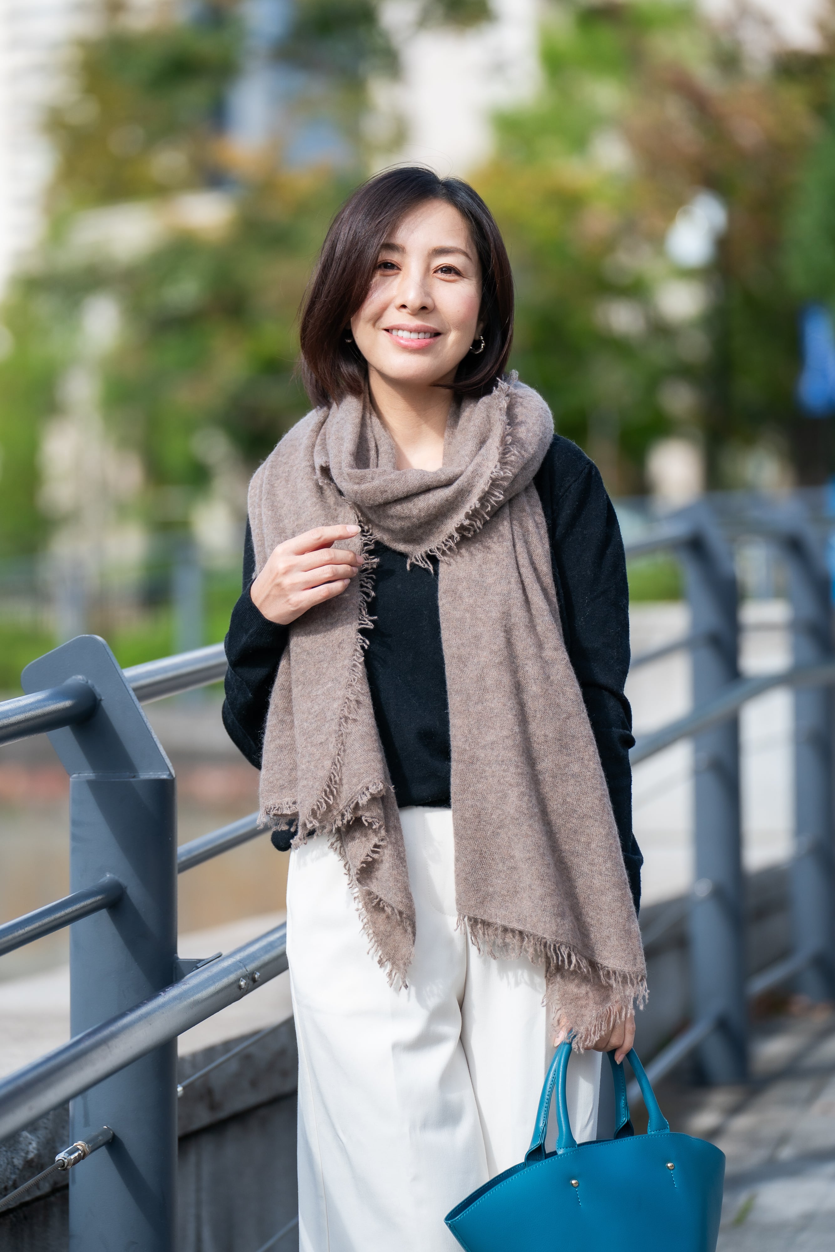 インド北西部・カシミールの雄大な自然に育まれたカシミヤ山羊の毛を、染色を一切施さず編み上げたストール。その素朴な風合いに、現代的で洗練されたスタイリングを重ねることで、日常を旅するような解放感と、ラグジュアリーな余韻を纏わせてくれる一枚です。