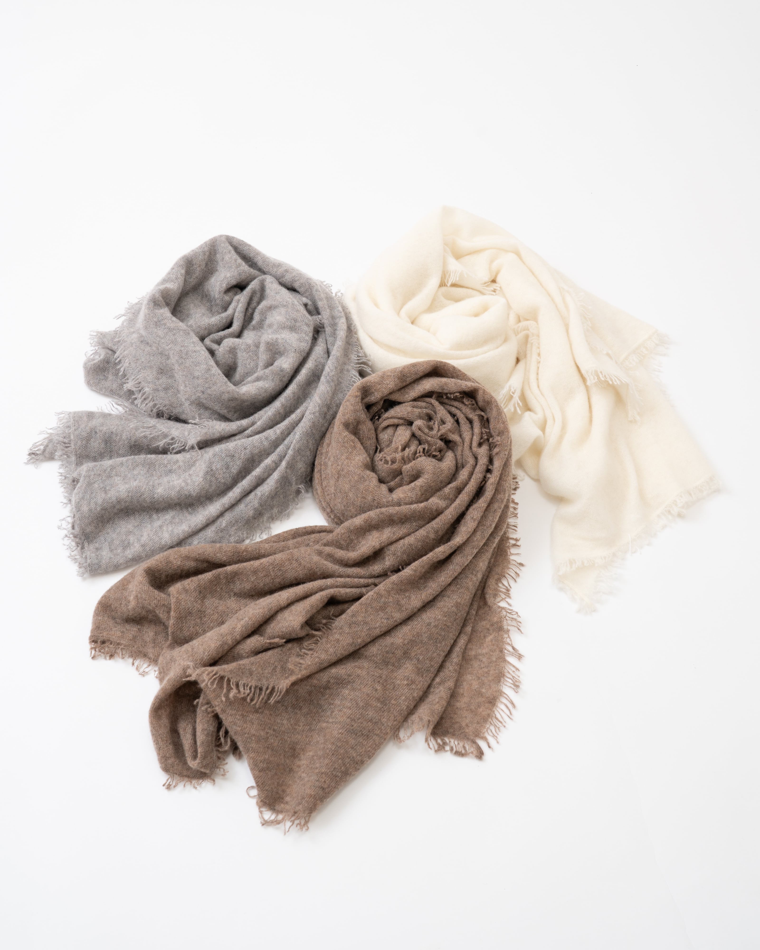 インド北西部の高山地帯・カシミール地区で育ったカシミヤ山羊の毛を、染色を一切施さず、そのまま編み上げた贅沢なストールです。カシミヤ糸本来のナチュラルな色合いを楽しんでいただけるとともに、ニットならではの柔らかな風合いと、包み込むような暖かさをご体感ください。