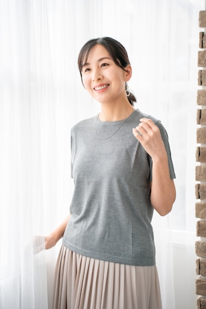 薄雲のように、軽やかでやわらかな陰影を纏うカシミヤシルクの通年半袖セーターです。シルクカシミヤ混の高級素材を使用し、柔らかなカラーを展開。シルクのなめらかな落ち感と、カシミヤのやわらかな温もりを掛け合わせ、春先から初夏、冷房の効いた室内まで長く活躍する一枚に仕上げました。