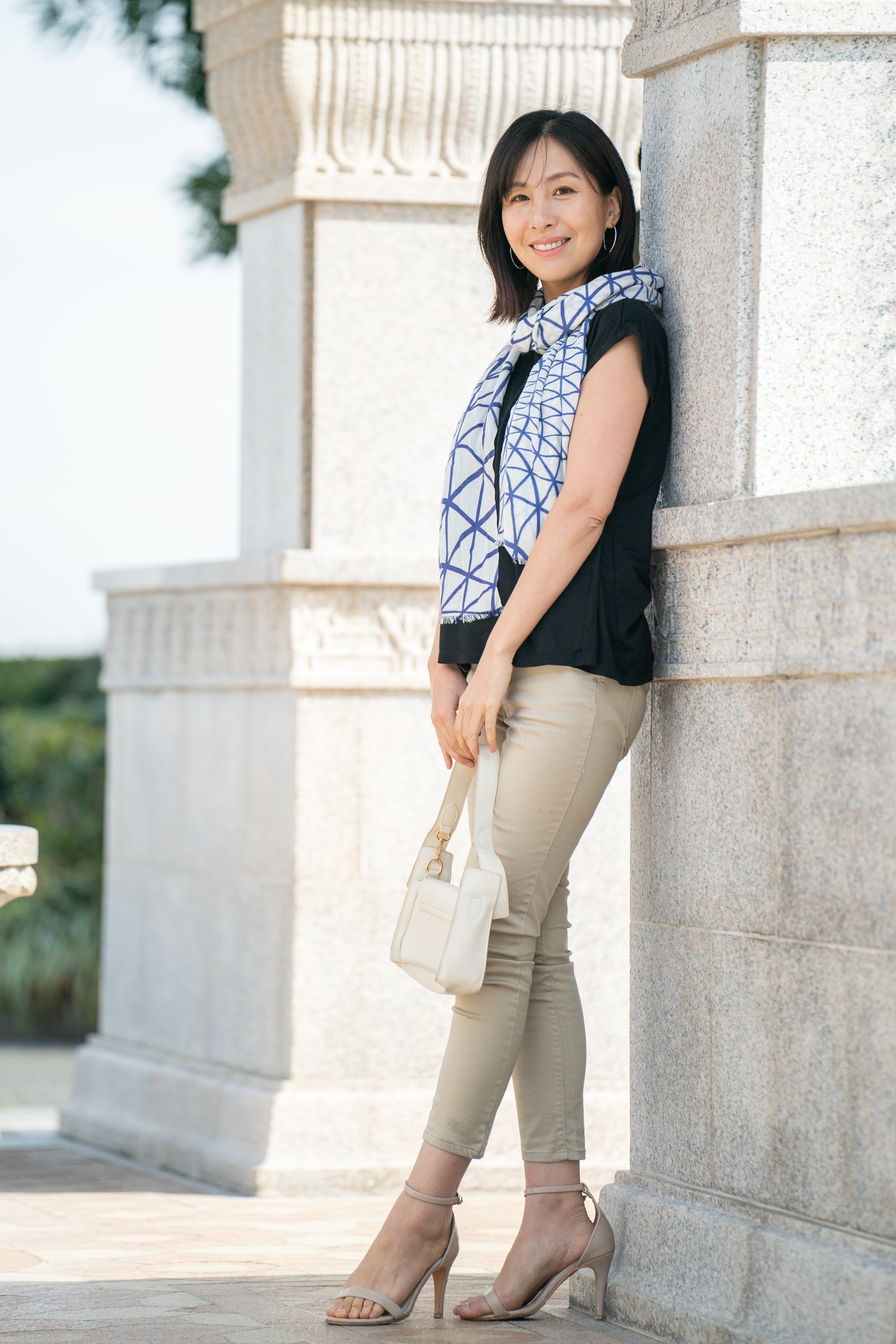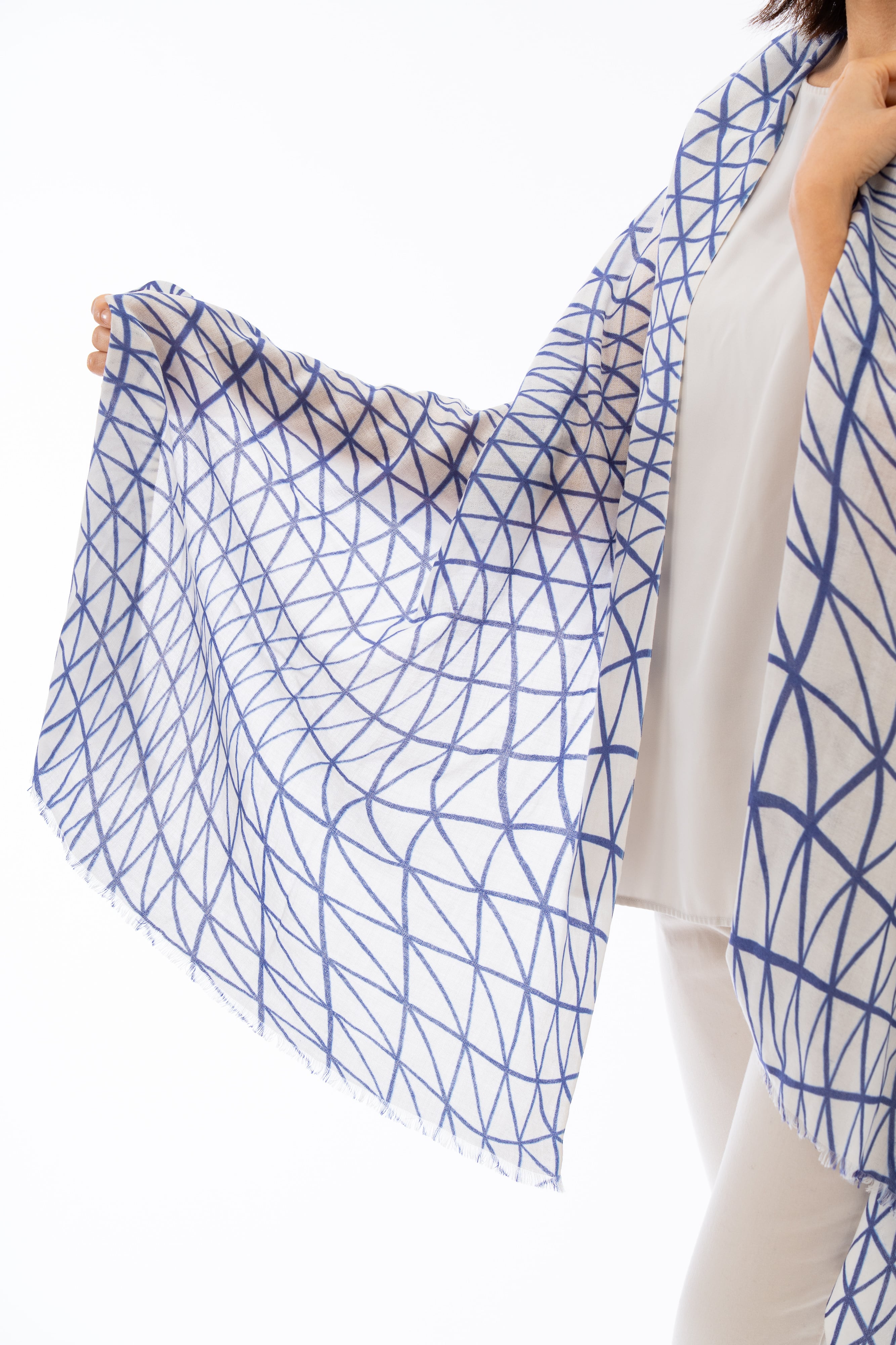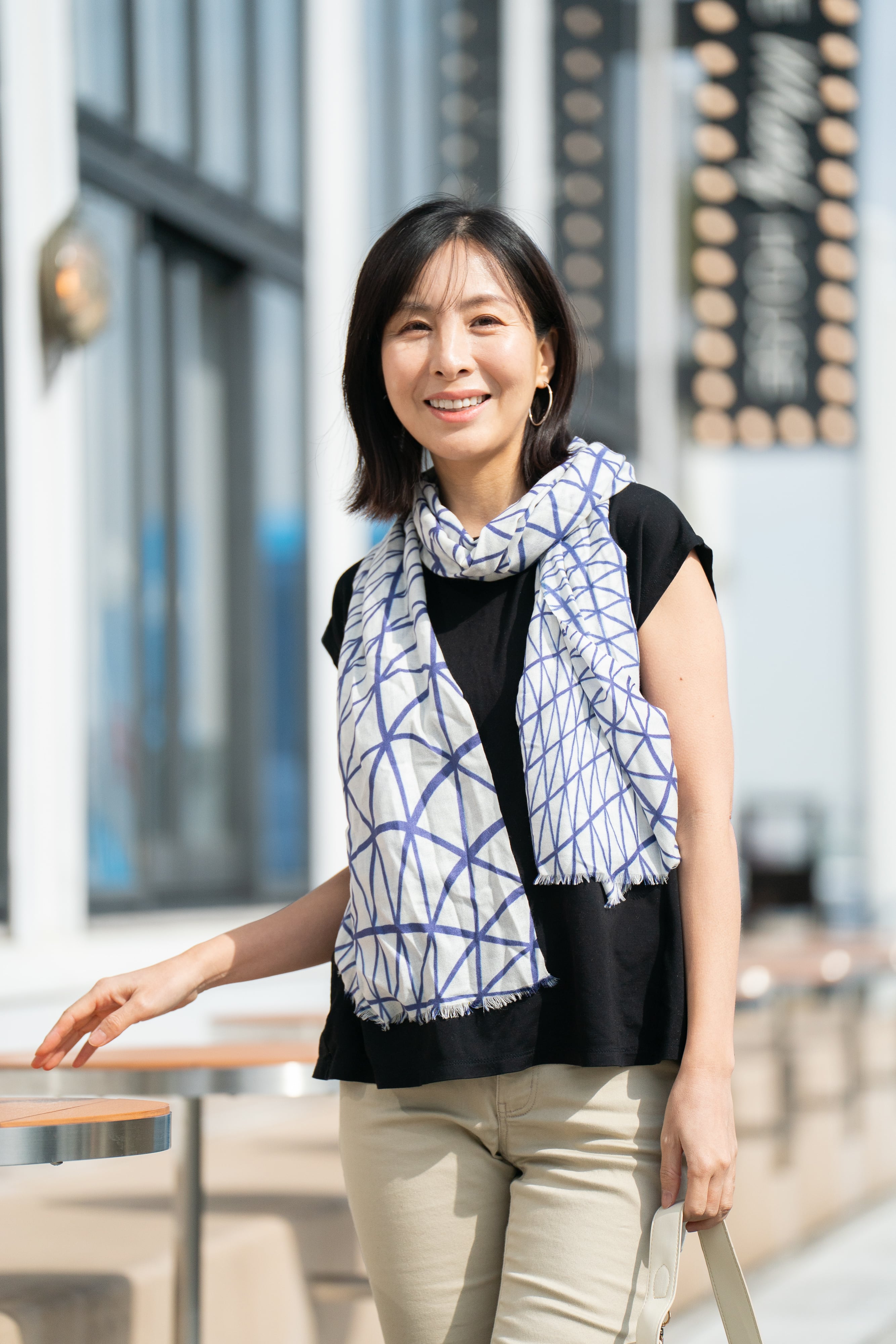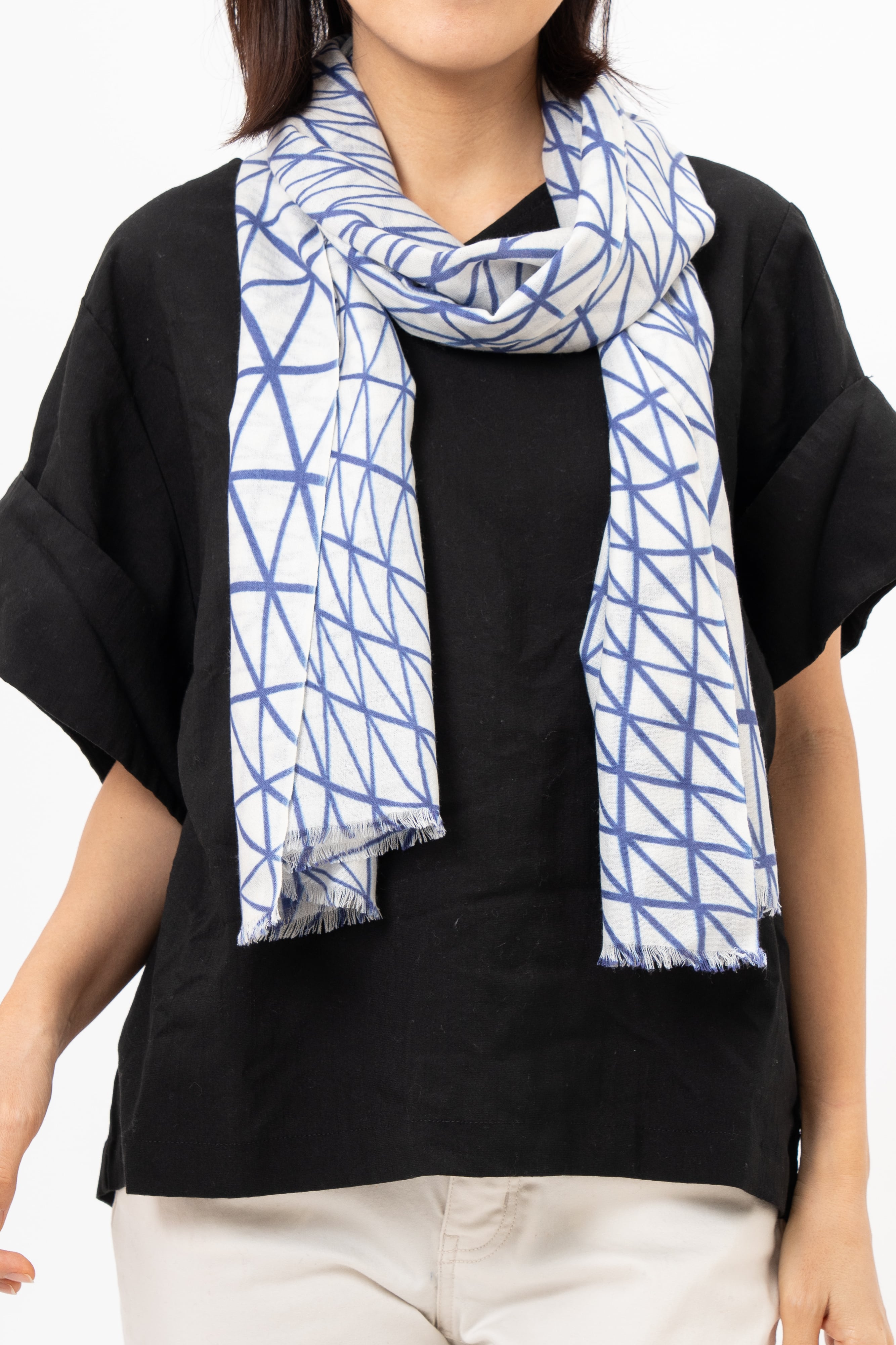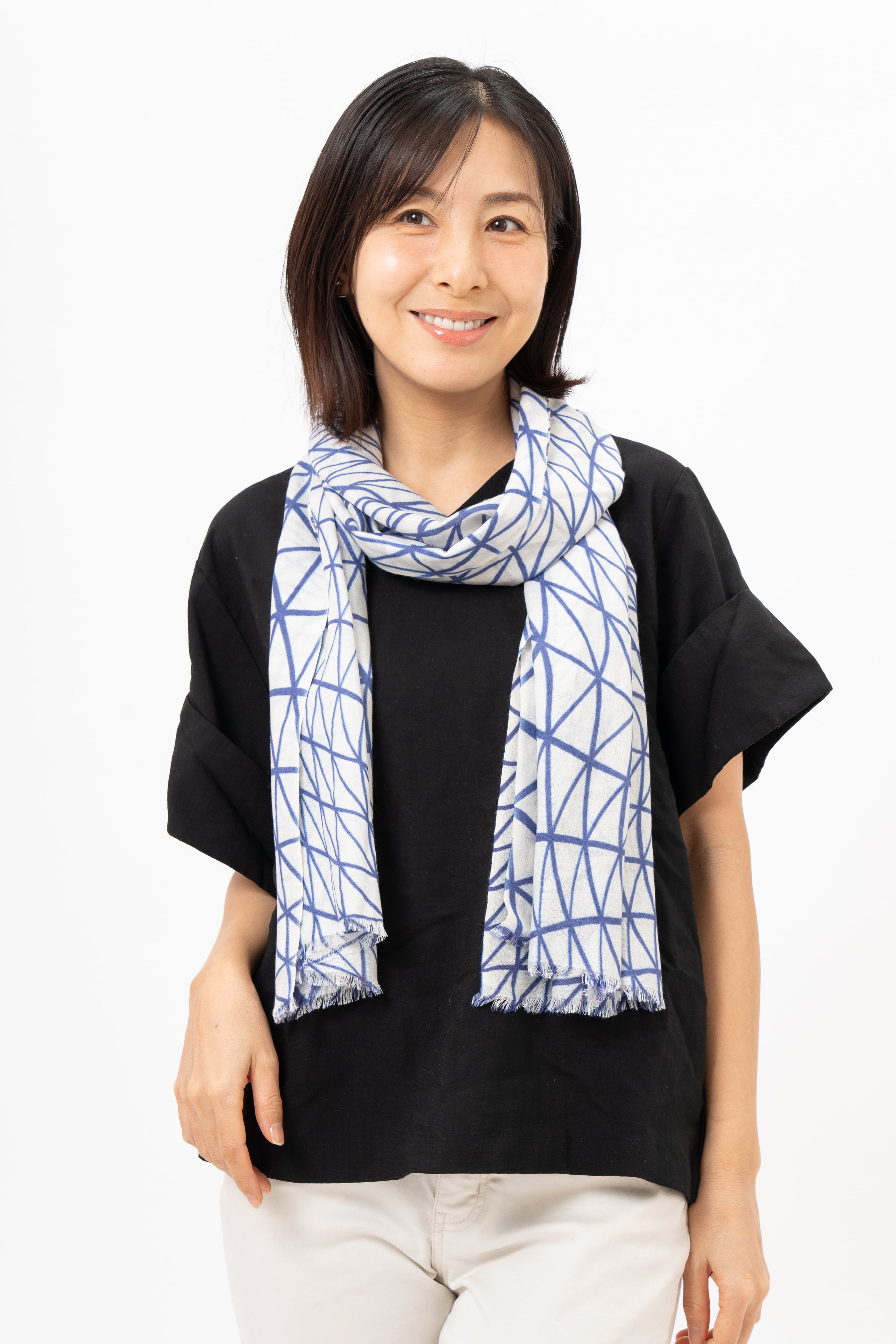 装いのアクセントとして、またUV・冷房対策としても活躍。薄く軽い素材なので、折りたたんでバッグに忍ばせておけます。変形水玉を、軽やかな配色でまとめた一枚。さりげなく襟元に華を添えます。