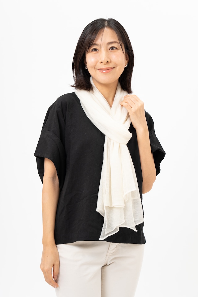 カシミヤ×シルク混のやわらかな質感が、首元を心地よく包みます。
