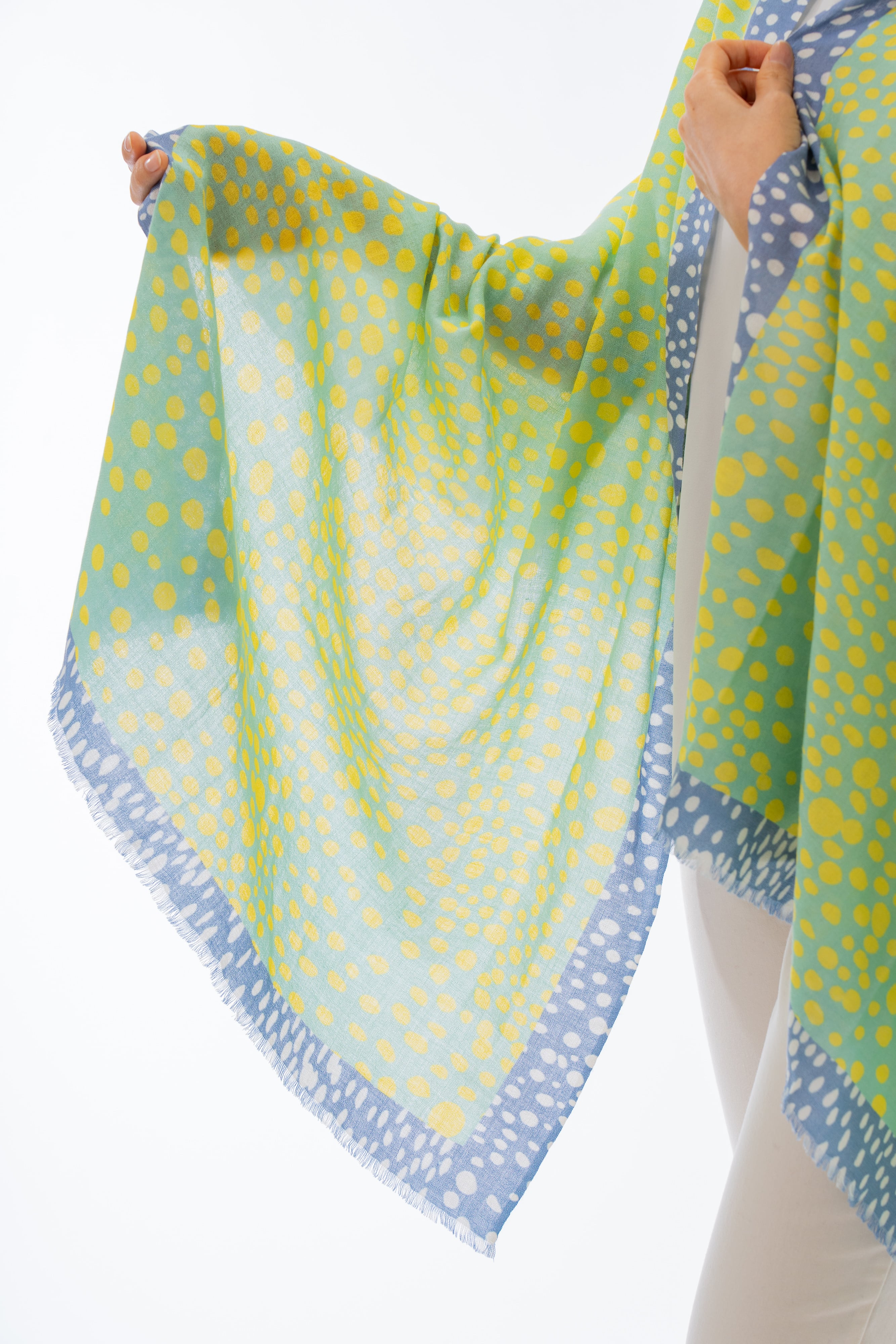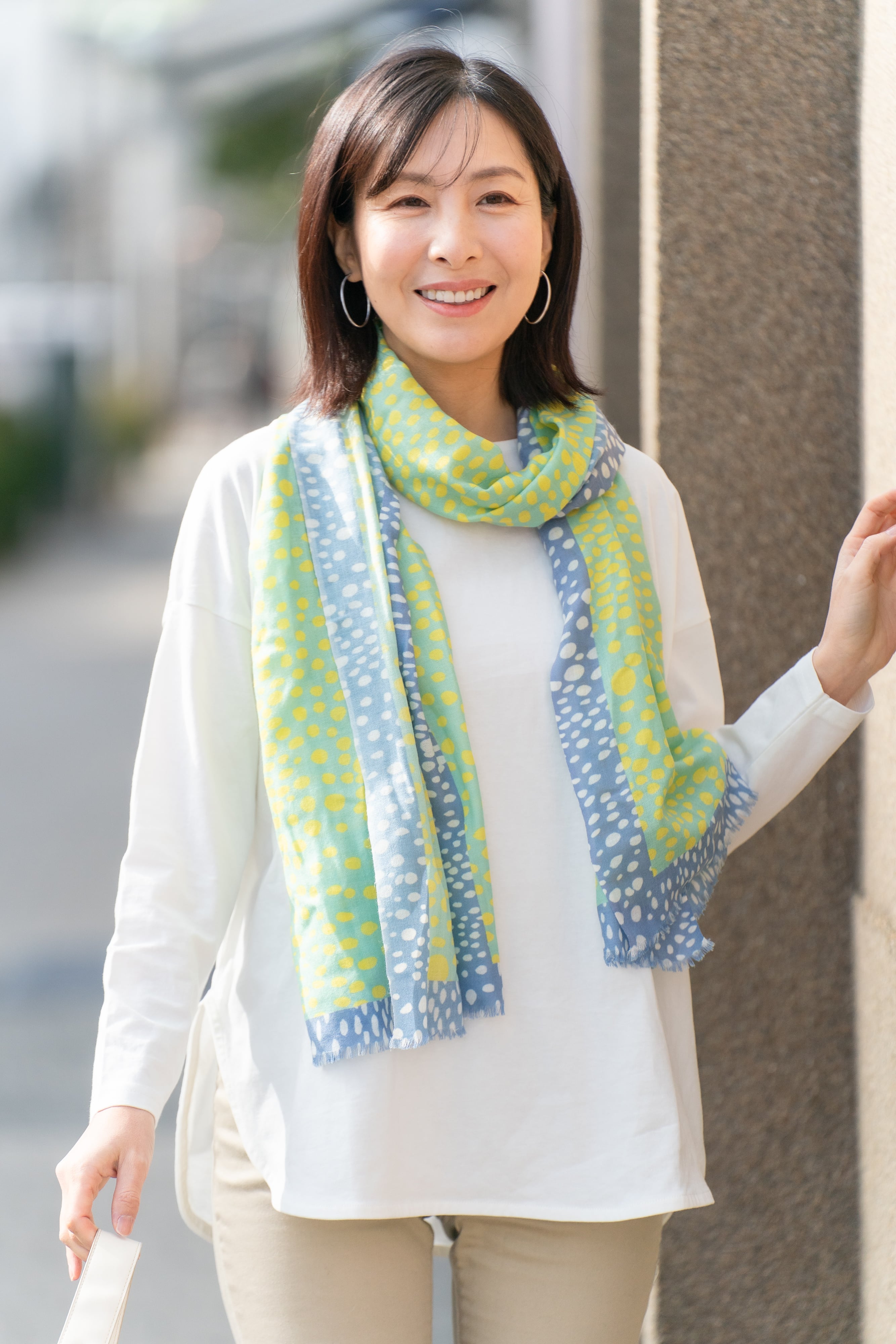 カシミヤ×シルク混のやわらかな風合いで、肌あたりも快適。ファッションのアクセントとしてはもちろん、UV対策や冷房対策にも活躍します。薄手で軽いため、折りたたんでバッグに入れて持ち運べるのも魅力です。シンプルな幾何柄を単色で仕上げ、さまざまなスタイルに合わせやすいデザインに。飽きのこない一枚として、日常に寄り添います。