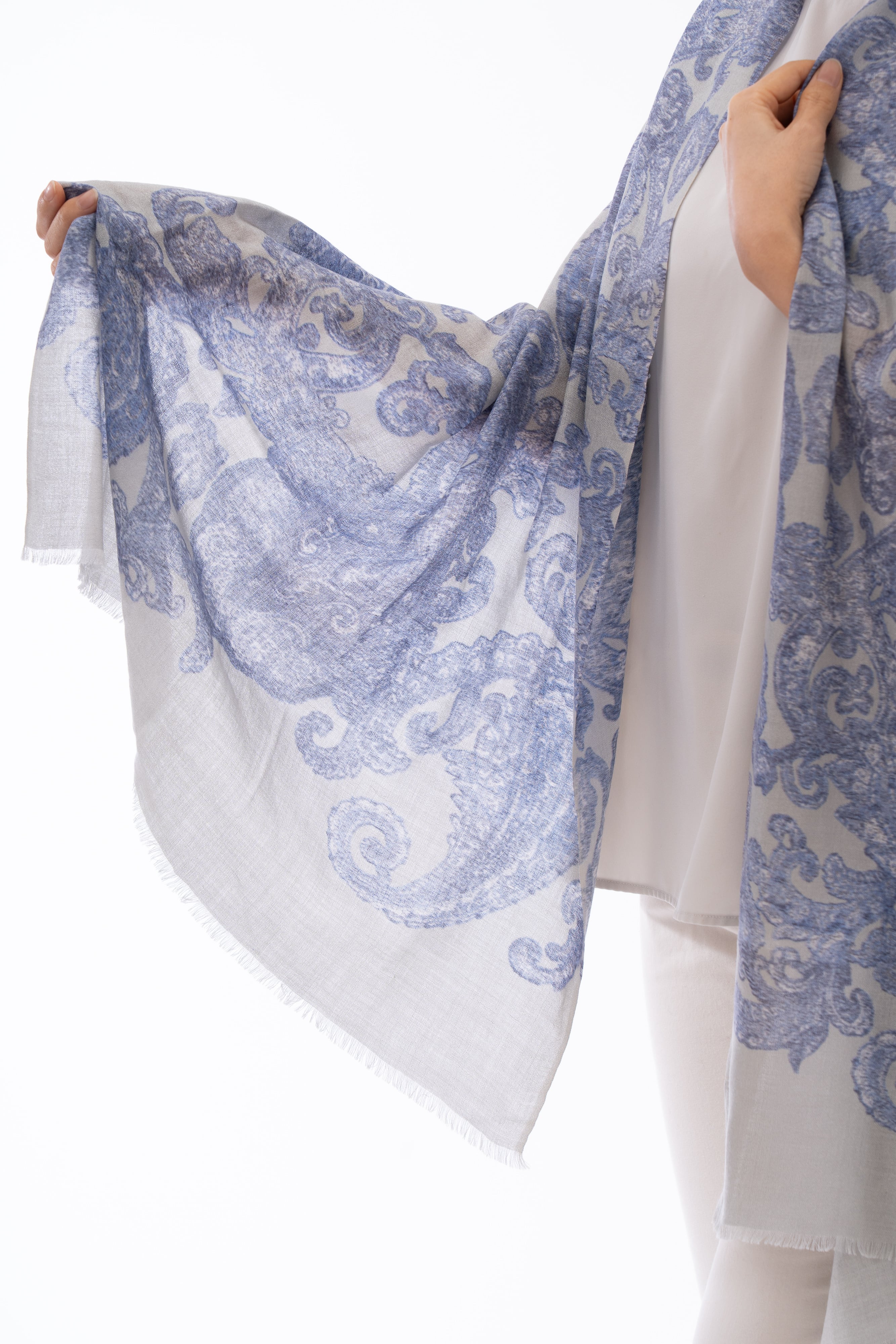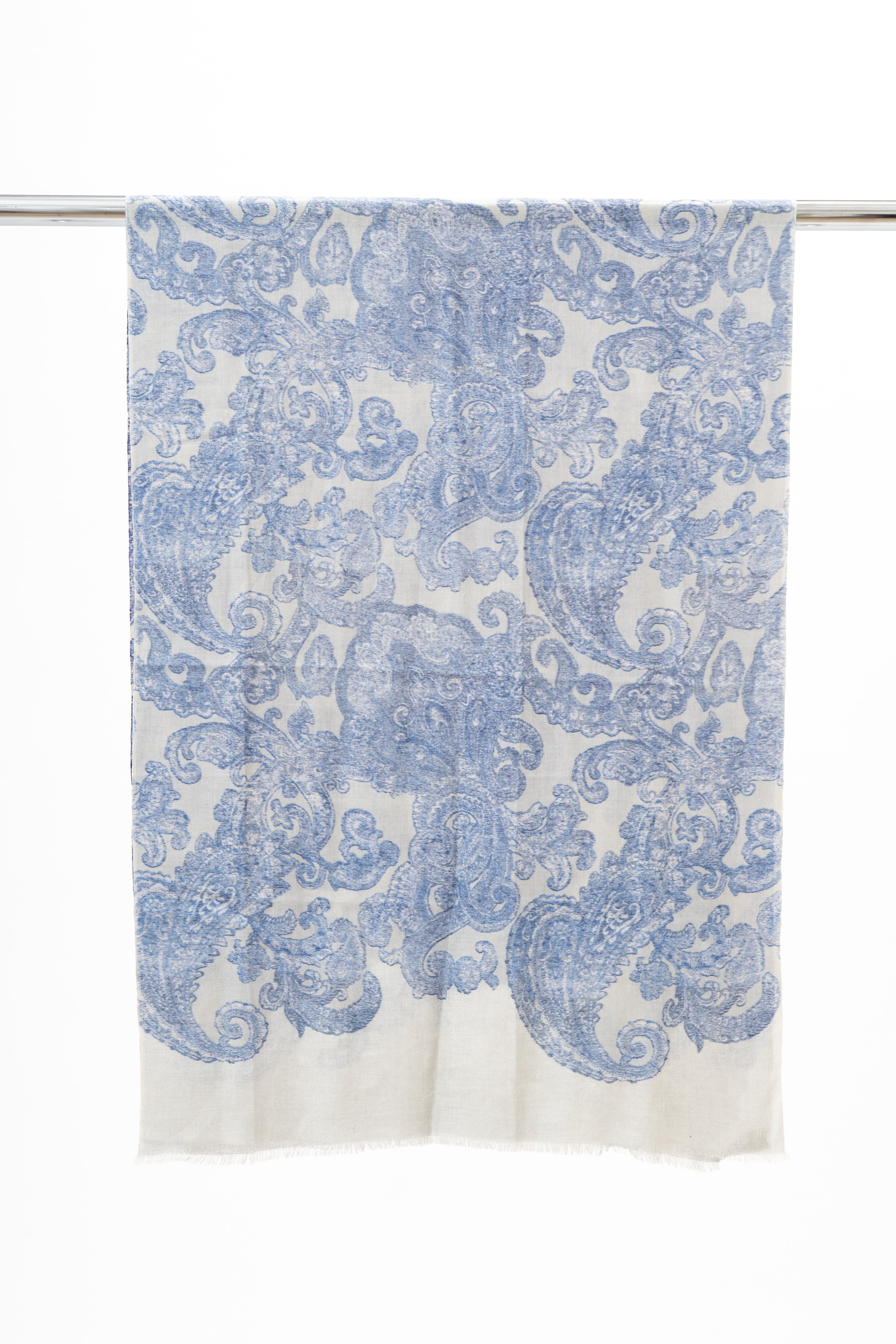 Kocho - 胡蝶/シルバー カシミヤ50%シルク50%ストール 幅65cm×縦180cm(本体部分)+1cm×2(房部分)