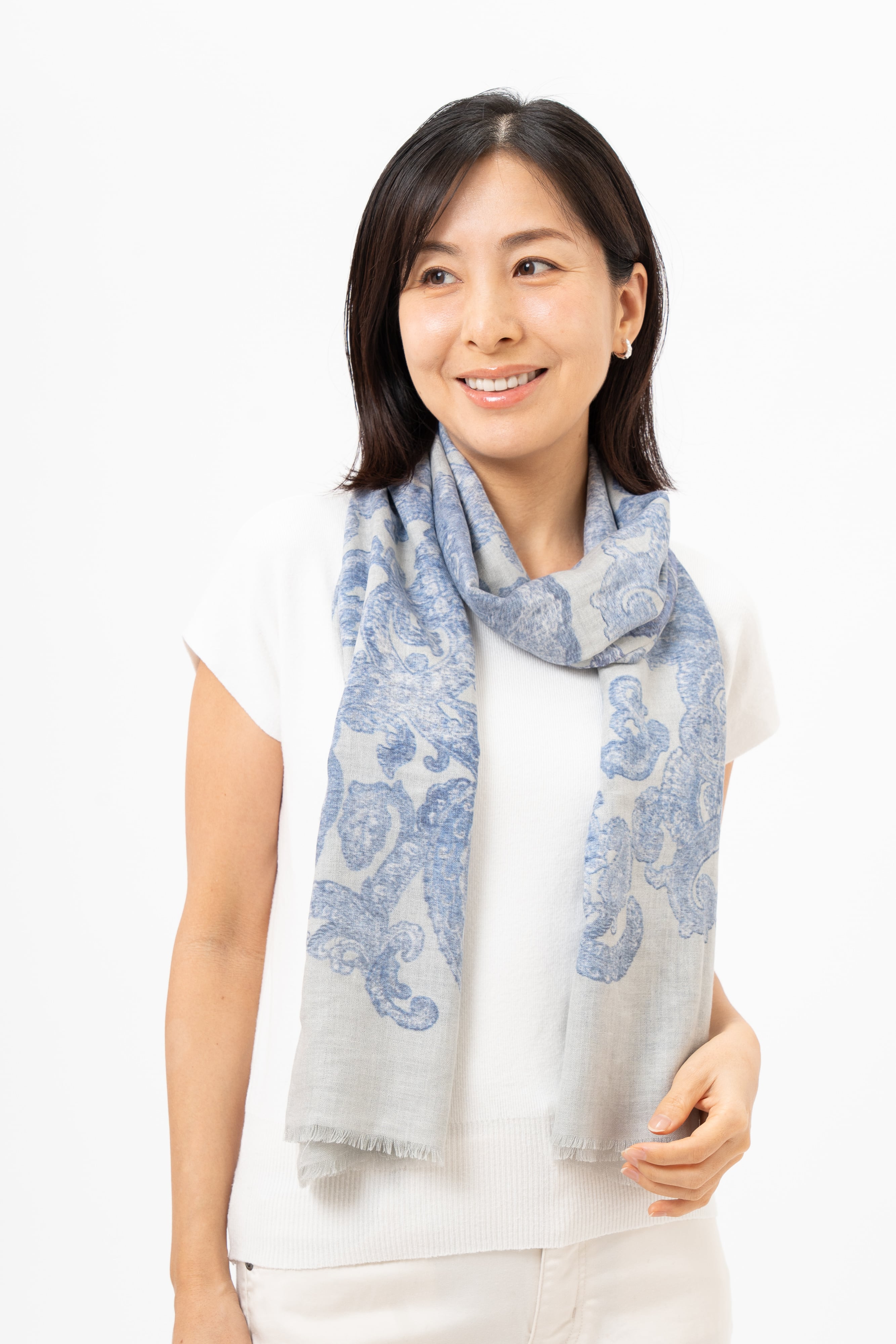 プリントの定番である更紗(さらさ)ペイズリー柄を、パステルカラーで仕上げた「Kocho」。シルバー/ブルーグレー/ピンクベージュの3色展開で、インナーにもアウターにも合わせやすく、装いをスタイリッシュに整えます。