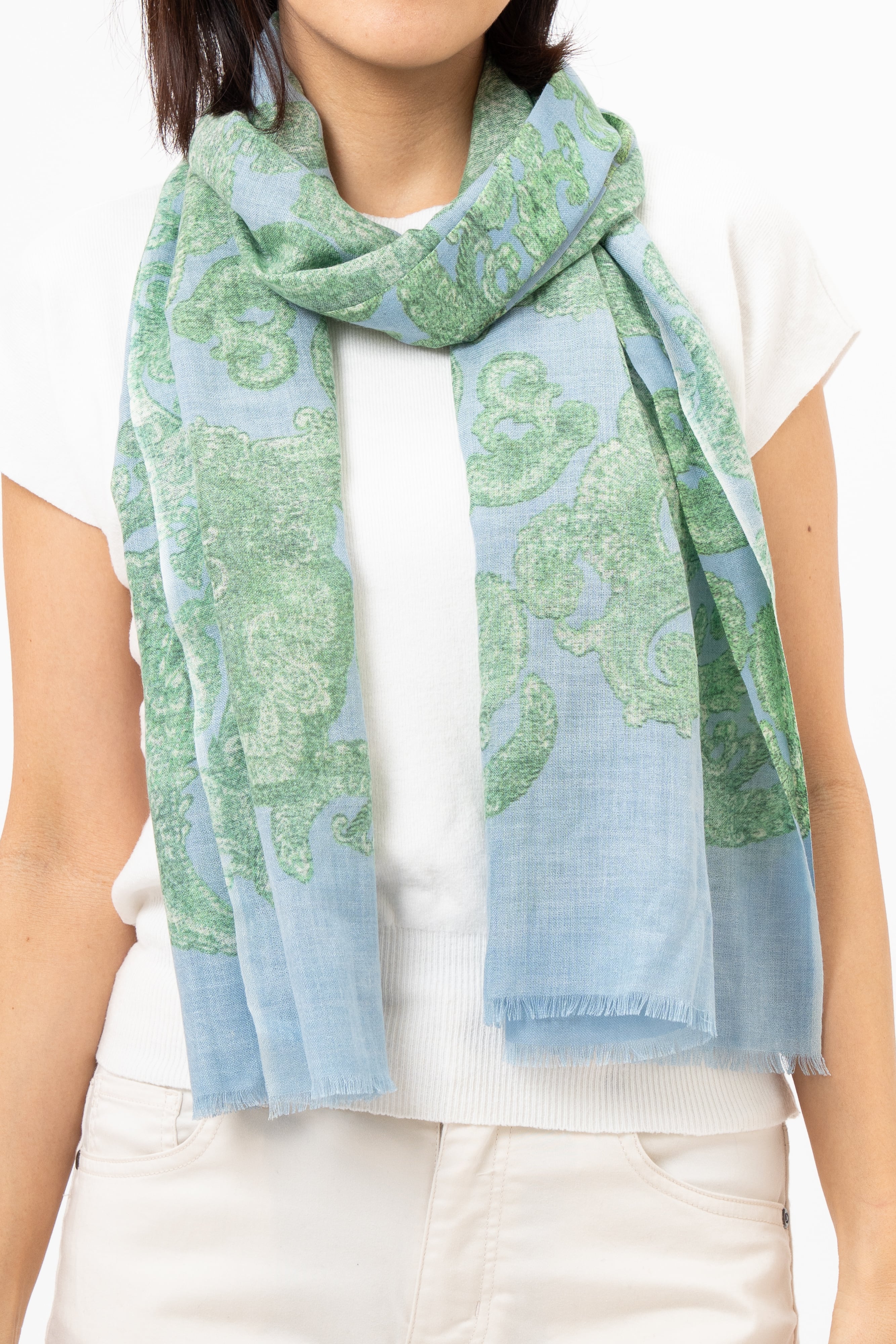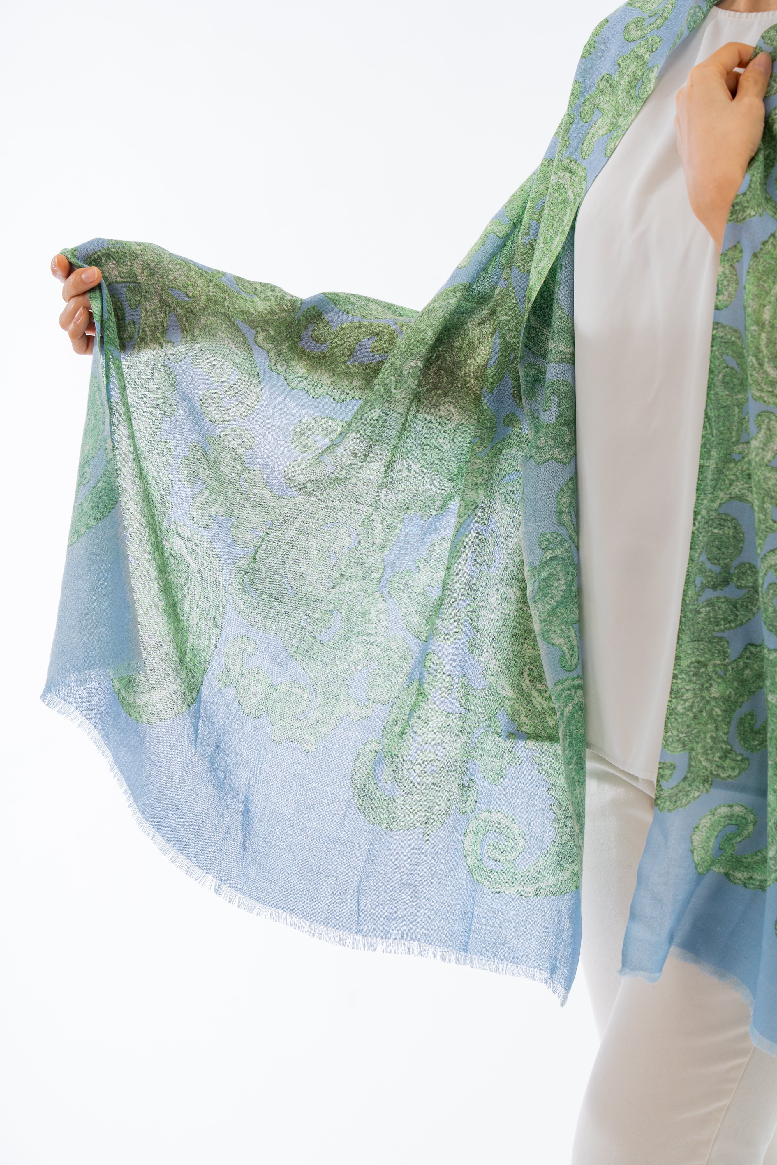 Kocho - 胡蝶/ブルーグレー カシミヤ50%シルク50%ストール 幅65cm×縦180cm(本体部分)+1cm×2(房部分)