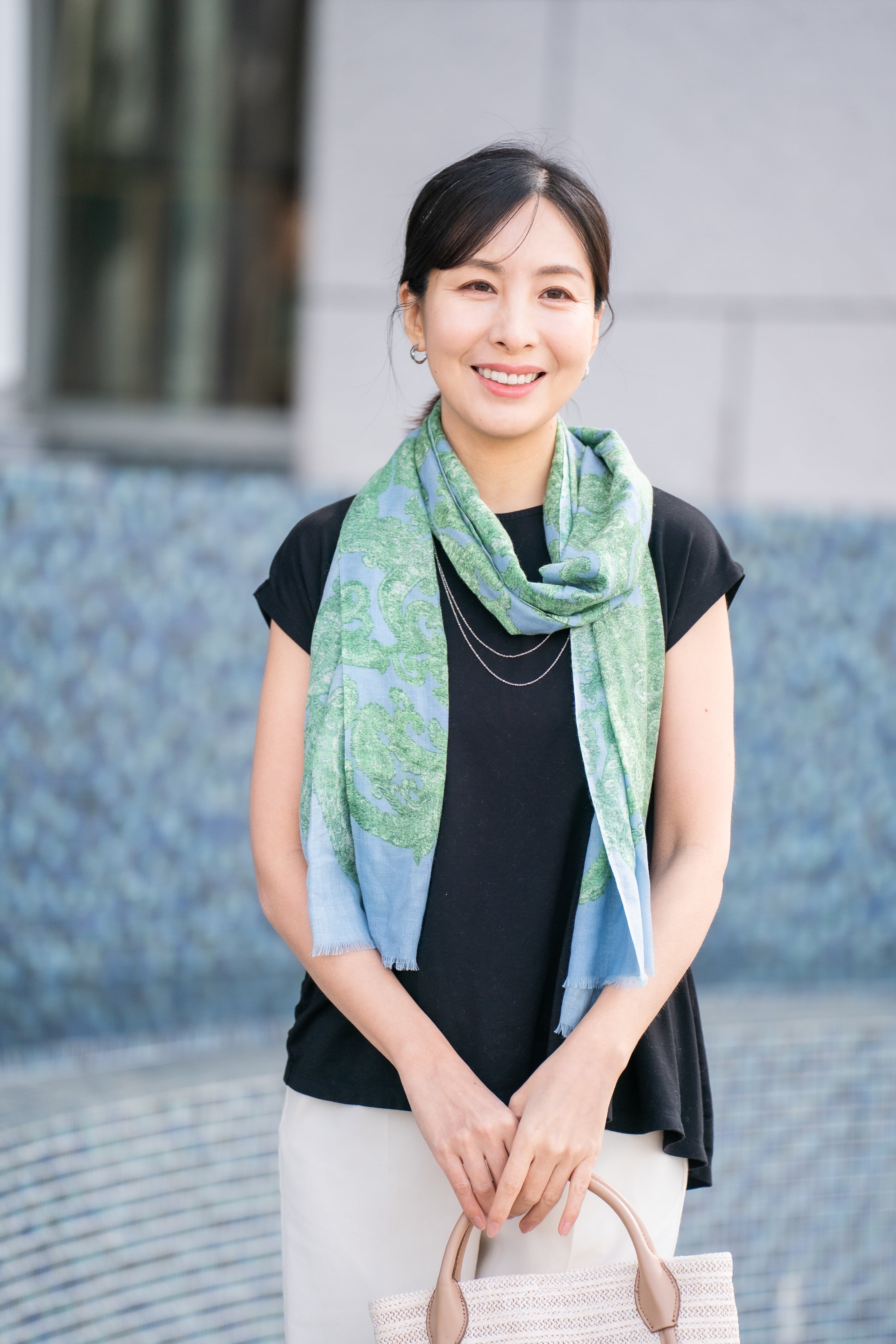 カシミヤ×シルク混のやわらかな風合いで、肌あたりも快適。ファッションのアクセントとしてはもちろん、UV対策や冷房対策にも活躍します。薄手で軽いため、折りたたんでバッグに入れて持ち運べるのも魅力です。