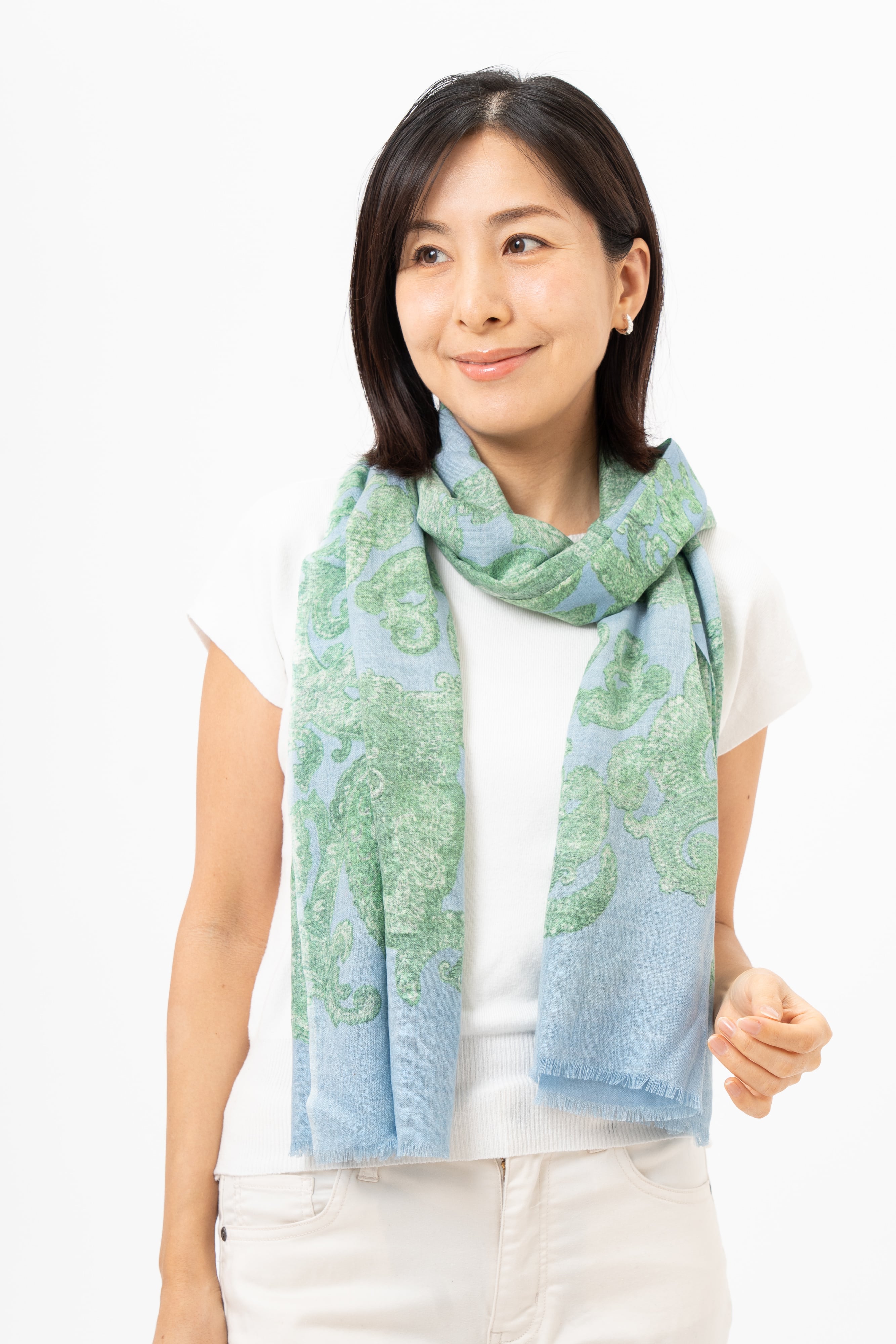 プリントの定番である更紗(さらさ)ペイズリー柄を、パステルカラーで仕上げた「Kocho」。シルバー/ブルーグレー/ピンクベージュの3色展開で、インナーにもアウターにも合わせやすく、装いをスタイリッシュに整えます。