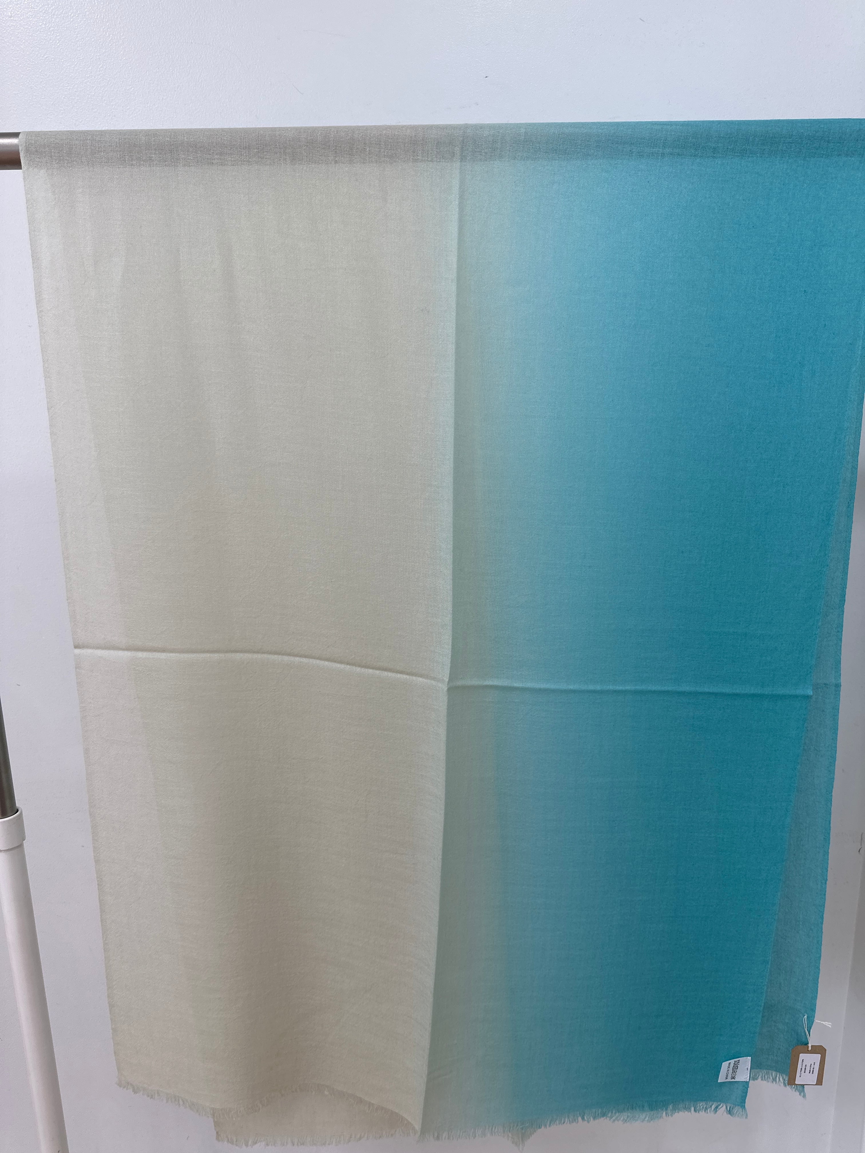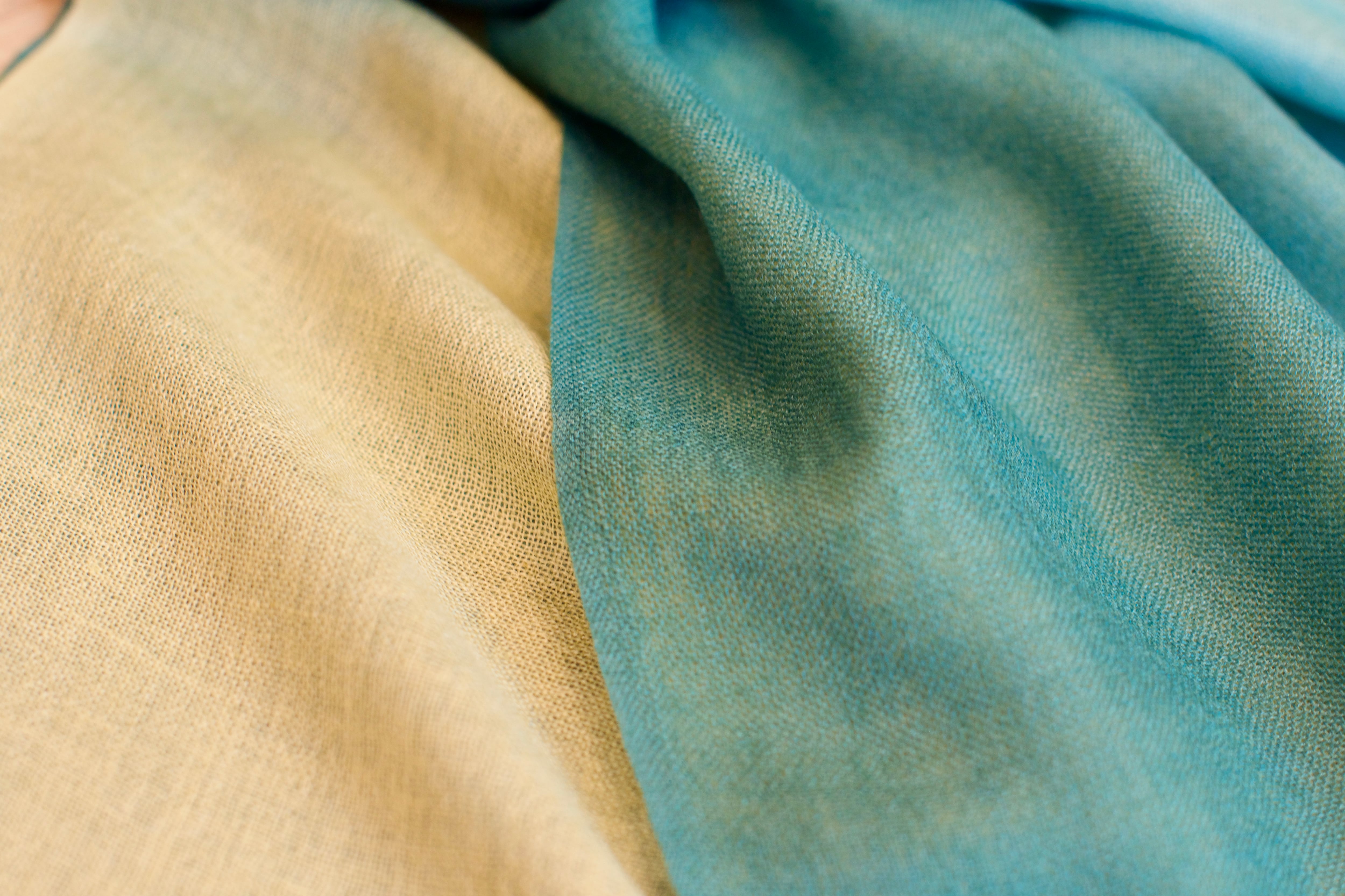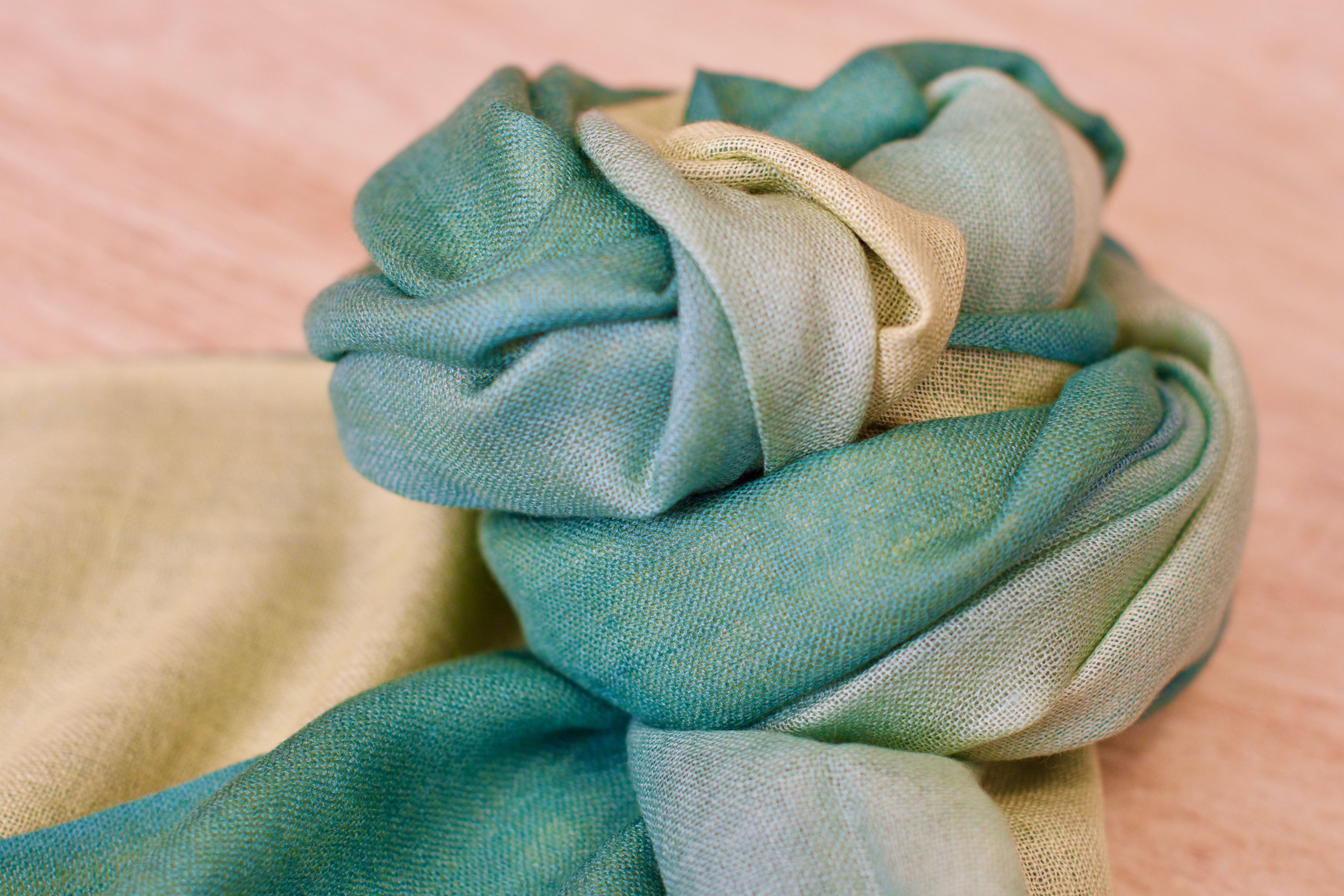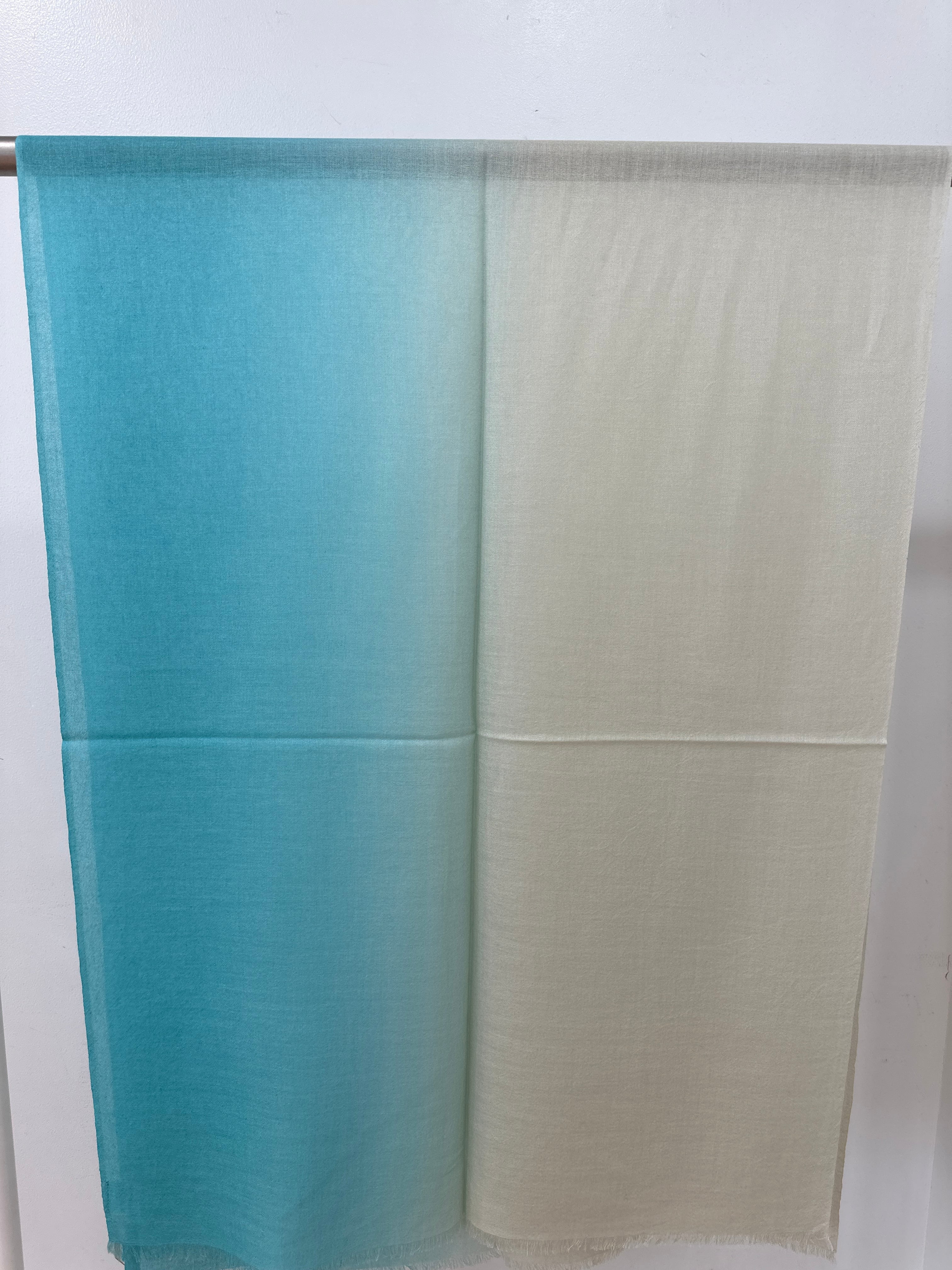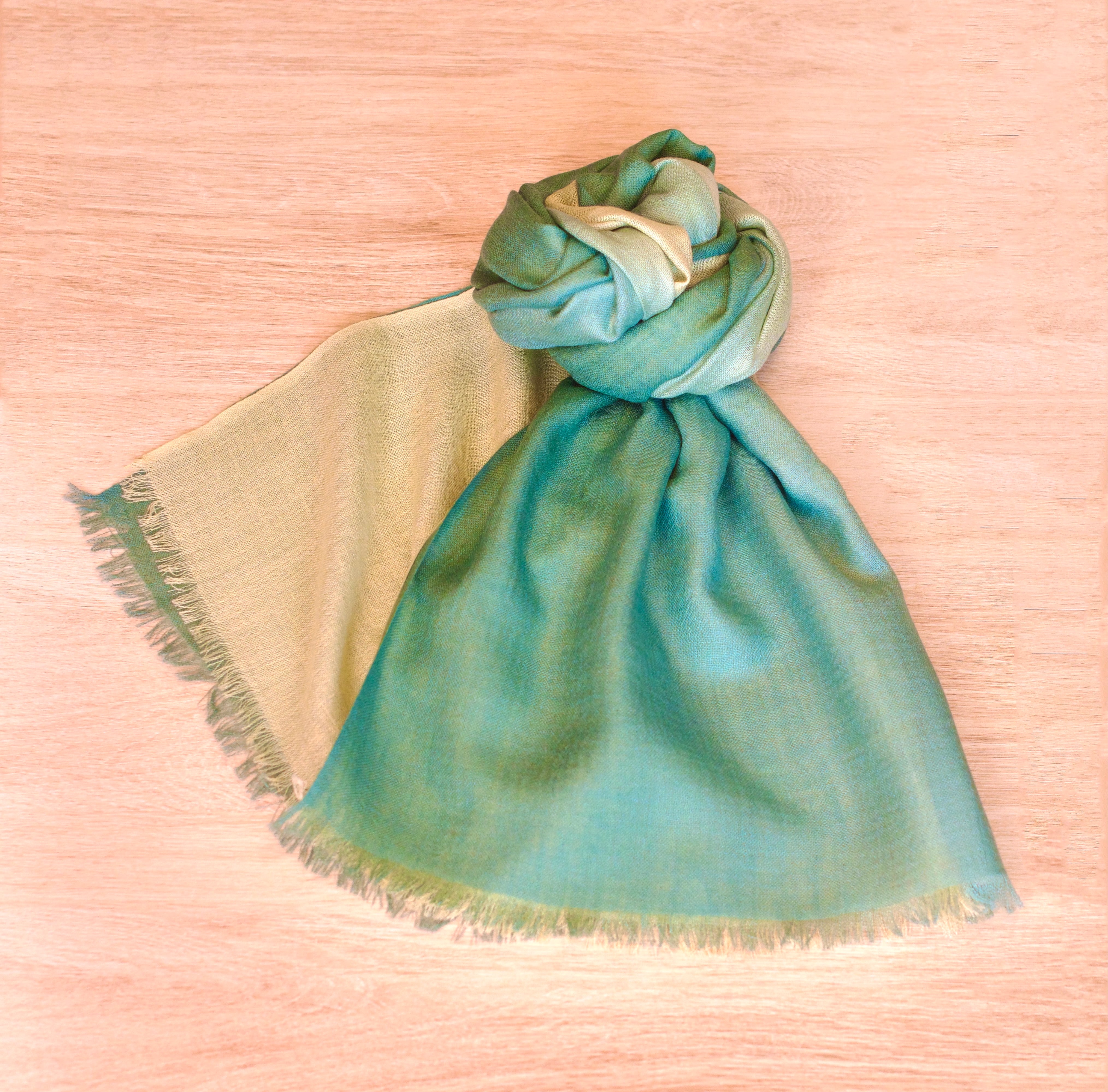カシミヤシルクの細番手で織り上げたスカーフに2色の違う色をオンブレー染(段染)しました。カシミヤの艶とシルクの光沢、濃色から淡色への色の変化があわさり、首元のおしゃれを表現します。また、違う配色の二枚を組み合わせるコーディネートも面白いのではないでしょうか。